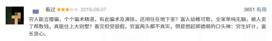 具体的观点大概有这些:“不合逻辑”、“富人一家太好骗,现实中不可能发生”、“穷人一家骗术高明、十项全能,明明可以凭本事找一份正经工作,怎么会混得这么穷,不现实”……