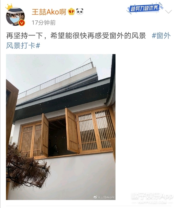转场间隙,看到好几次他拿起手机对着雪花和茶馆拍着什么。这不,前两天,我们就在微博上看到他的摄影大作,雪花、窗户还有小巧思的构图。原来是喜欢记录美好,也愿意分享的小朋友呀!