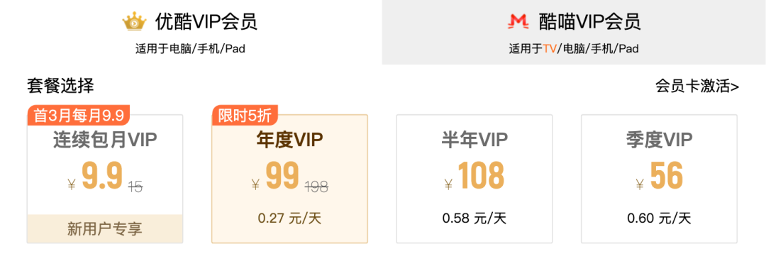 几大视频网站在拉新方面早早打起“价格战”,优酷会员年费由254元降至99元,并免费加赠3个月,相当于15个月VIP会员;爱奇艺新用户年卡特惠价是99元,手机、电脑、iPad平板电脑等终端均可使用。芒果TV则面向所有用户提供免广告、看付费内容的权益,全平台在7天免费会员基础上,主动延长免费时限。对于普通用户来说,价格战带来了摸得到的实惠,打折后,花费一个平台的原价会员费可以购买三个平台的VIP。
