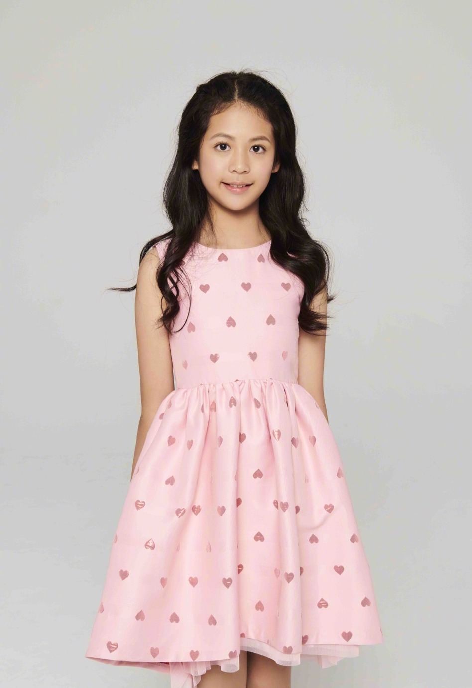翁虹女儿穿粉色裙子,乖巧可爱。