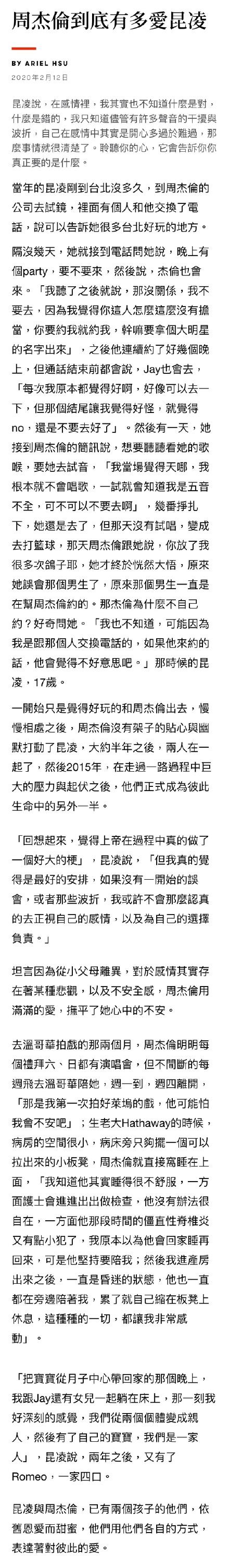 13日情人节前一天,网上曝光周杰伦和昆凌的爱情故事,两人在昆凌17岁交往,交往四年后订婚,已经结婚五年,育有一双儿