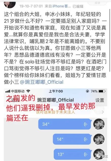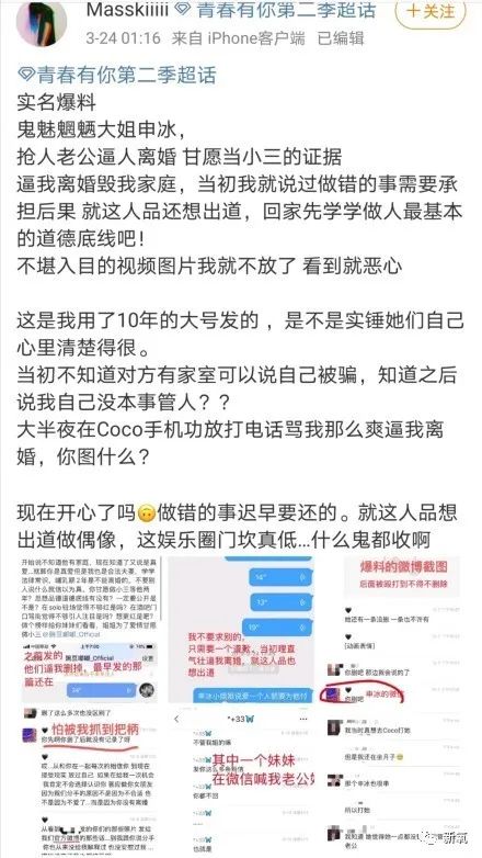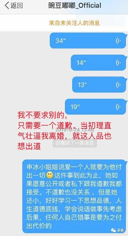 一起看看这个所谓当事人放出来的料,到目前为止还只有聊天记录面世,算不上特别的锤(但已经够让人震惊的了)。当事人,也就是原配,表示去年节目开始炒热度的时候就已经联系过申冰的经纪公司,要求一个说法。
