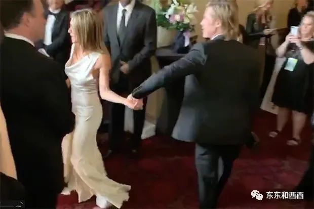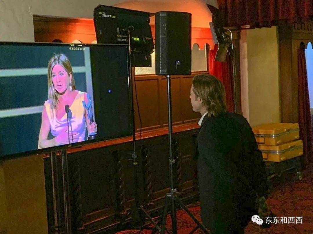 安妮斯顿获奖时,皮特在后台忍不住发出哇的一声赞叹↓↓