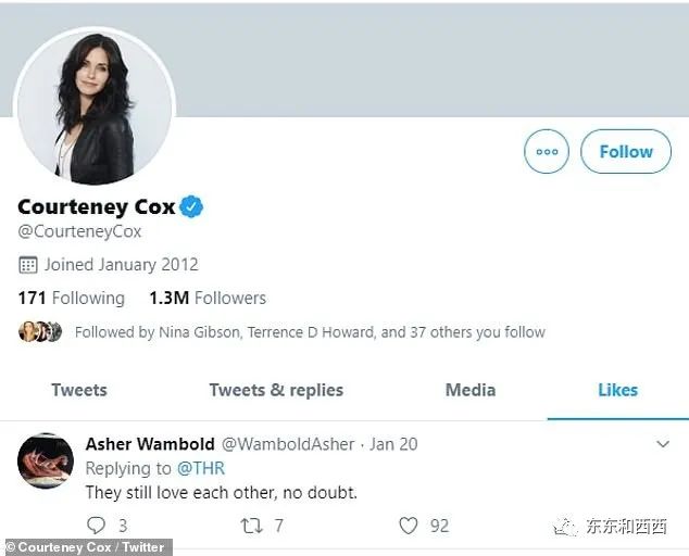 就连安妮斯顿最好的朋友柯特妮·考克斯,也在推特上给一条“ 毫无疑问,他们依然爱着对方 ”的推文点赞↓↓