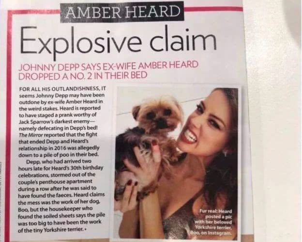 期间,艾梅伯还被爆吵架后在德普床上拉粑粑,事后还推脱到狗狗身上