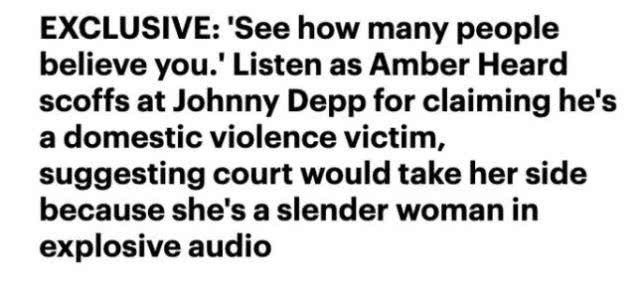 艾梅伯在录音中声称说“我没有打你,我只是揍了你”,还挑衅般地说:“强尼,告诉这个世界,告诉他们,‘我,一个男人,我也是家暴受害者’,看看有多少人会相信你,站在你这边”。