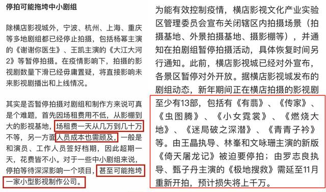 据说在新年期间停拍的影视剧至少有十三部左右,包括搭档王一博、赵丽颖的复工之作《有翡》、林峯主演的《倚天屠龙记》、甄子丹的《极地搜救》等等全部面临延期,损失上千万。