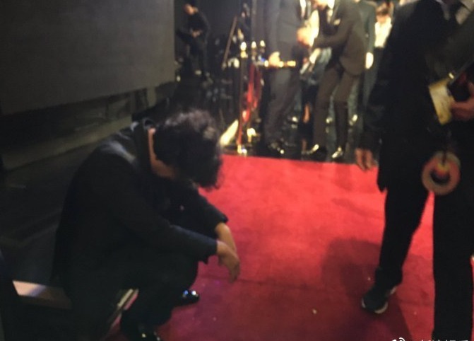 颁奖典礼结束后,奉俊昊走出内场蹲地笑侃:“难以置信,蹲下来冷静一下。”