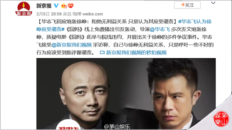2月5日晚20:58分,@新京报我们视频 就发布了对毕志飞的采访视频,视频里毕志飞称“自己与徐峥无利益关系,只是呼吁一些不好的行为应该受到批评跟谴责。”