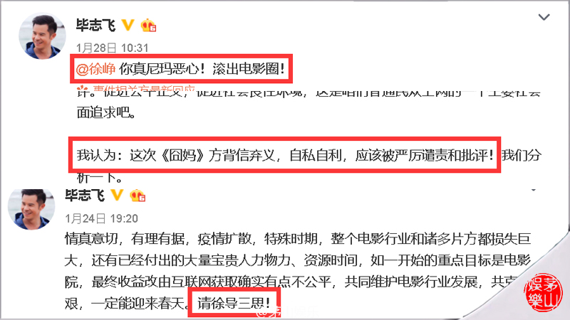 对这段时候毕志飞炮轰徐峥事实稍微有所了解的人都知道,从“请徐导三思!”,到“《囧妈》方背信弃义,自私自利”,再到“@徐峥 你真尼玛恶心!滚出电影圈! ”不过短短的3-4天的时间,毕志飞毕导翻脸的速度可真是比翻出还快。而他的目光也从影片《囧妈》上,转移到导演徐峥身上,把若干年前的所谓徐谓的黑料拿出来再使用一番,从而他得出一个结论,那就是徐峥人品不行,不配在电影圈里待着了。