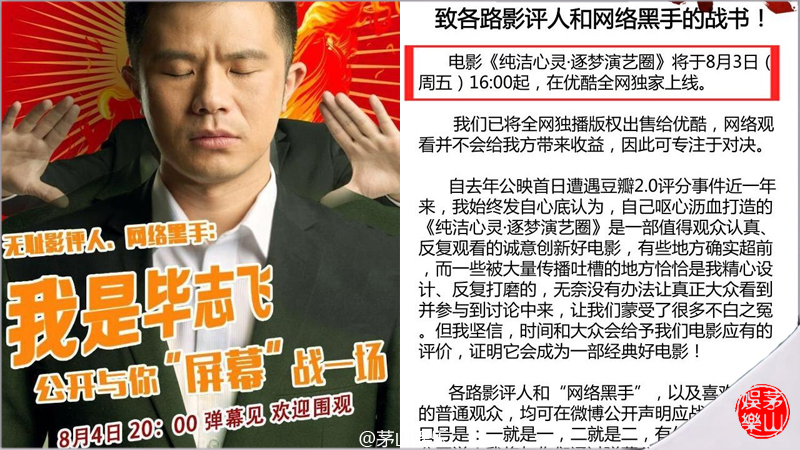 到了2018年8月3日下午16:00整,已经卖身的《纯洁心灵·逐梦演艺圈》正式在优酷独家上线,而导演毕志飞还发布“致各路影评人和网络黑手的战书”,要在(2018年)8月4日晚上20:00与这些“无耻影评人、网络黑手”在优酷平台的电影弹幕上对战。不过,据围观的网友介绍,尽管没有什么影评人理会他,但场面还是很尴尬,因为真的没有几个人能耐心看完这部片。