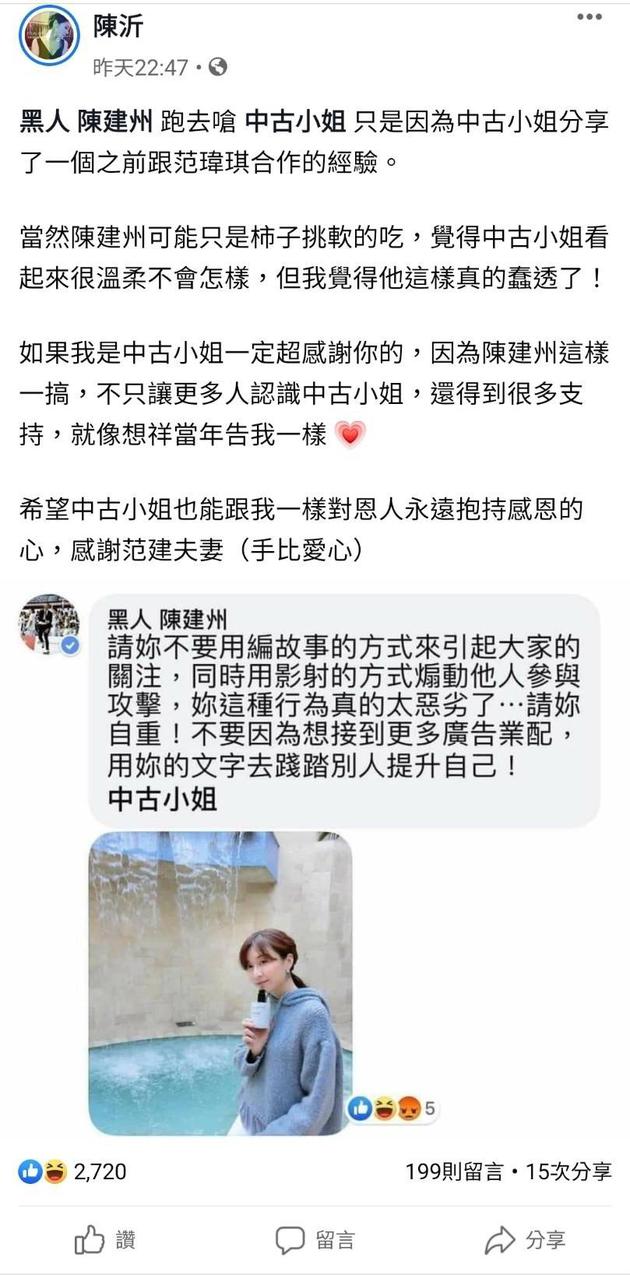 陈建州出面护妻一事也引发了网友的议论,有网友留言狂酸,就连网红陈沂也讨论起这件事情,认为陈建州“可能只是柿子挑软的捏,觉得中古小姐看起来很温柔不会怎样,但我觉得他这样真的蠢透了!”认为黑人这么做指会让更多人转而支持中古小姐。对此,中古小姐也出面抱歉,称“啊⋯陈沂竟然分享,浪费你一个版面真的非常抱歉”,陈沂则回:“那就要快点跟陈建州说:感恩的心感谢有你(手比爱心),做人要懂得感恩”。