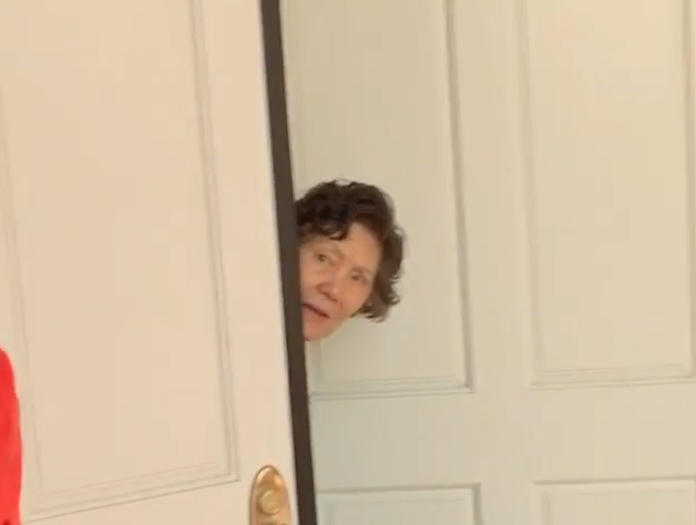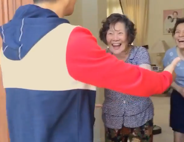 结果他们来到门前,老人打开门时看见这个惊喜显得非常开心,一家人合影画面十分温馨。