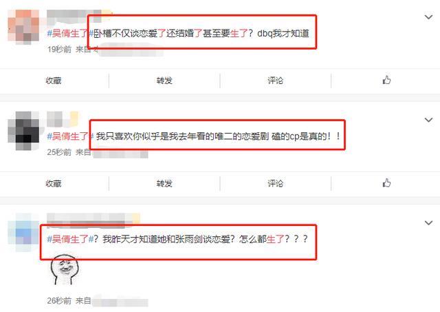 既然是生孩子的瓜,大家对这个传说中“吴倩孩子的爸爸”格外感兴趣,有吃过吴倩“瓜”的网友说到了重点:“我昨天才知道她和张雨剑谈恋爱,怎么都生了?”