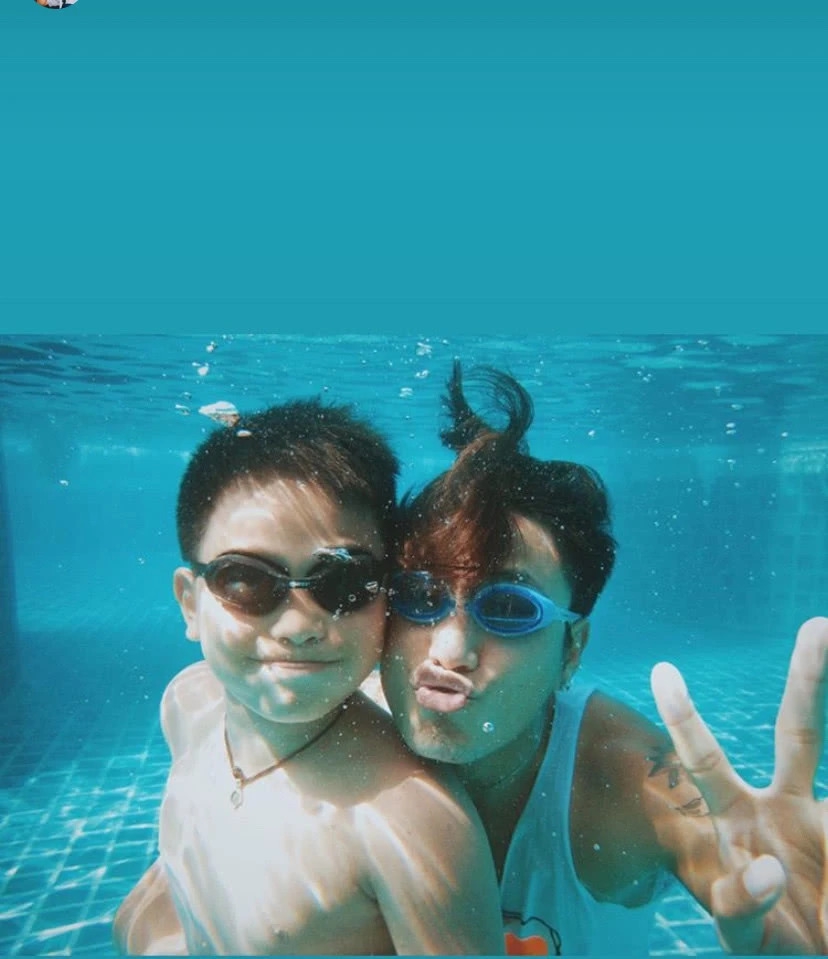 这张照片是在水下拍摄的,当时的优优看上去只有七八岁的样子。父子俩戴着泳镜在水下憋气,温馨十足。
