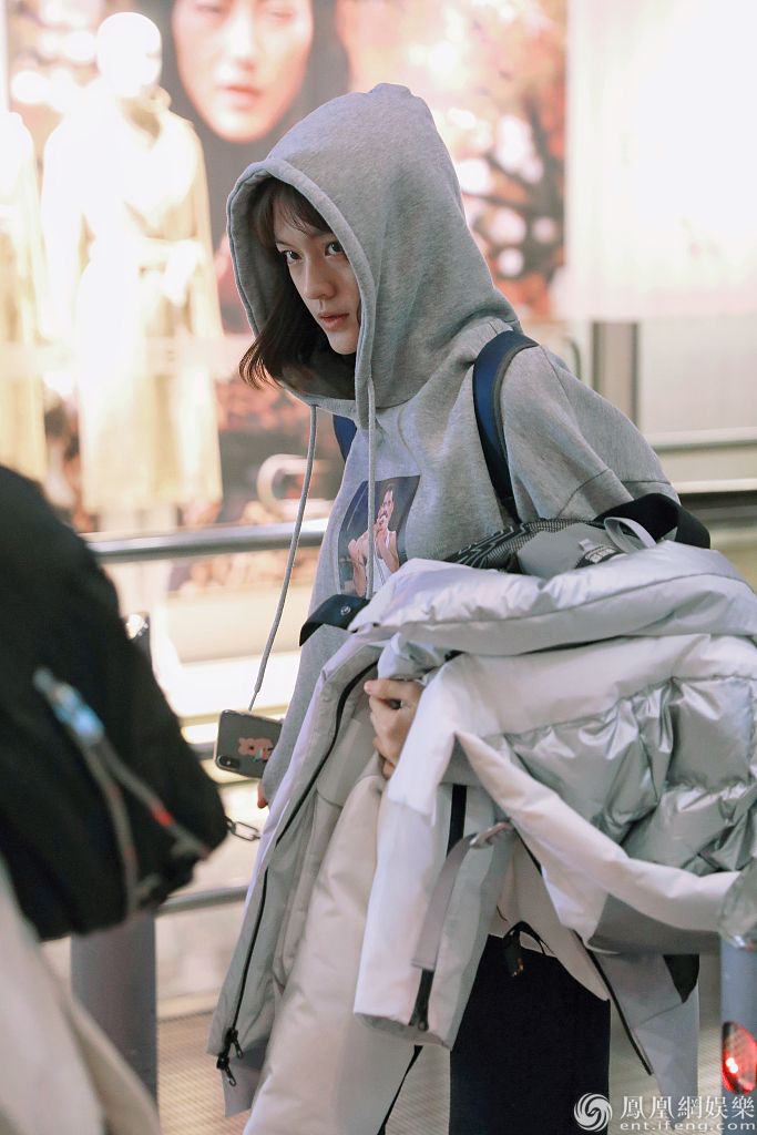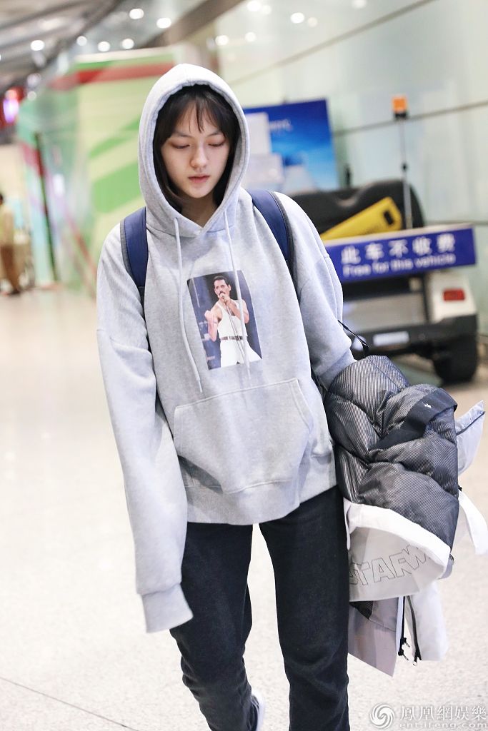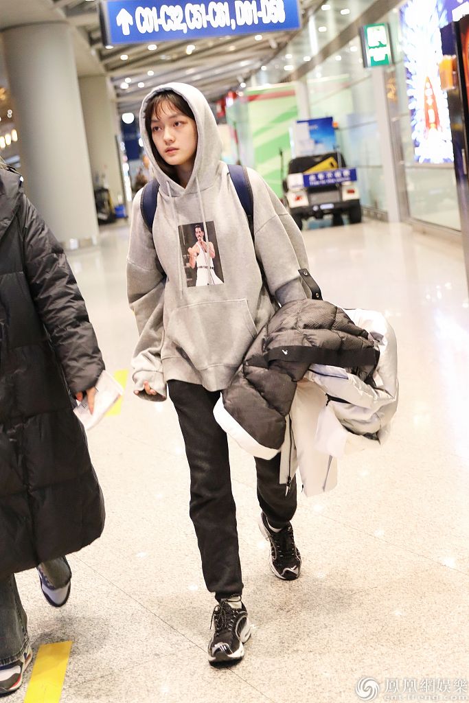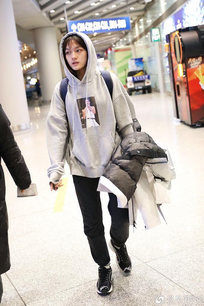 她身穿功夫图案连帽卫衣休闲时尚,黑白look造型保暖低调,走路也是气场十足。