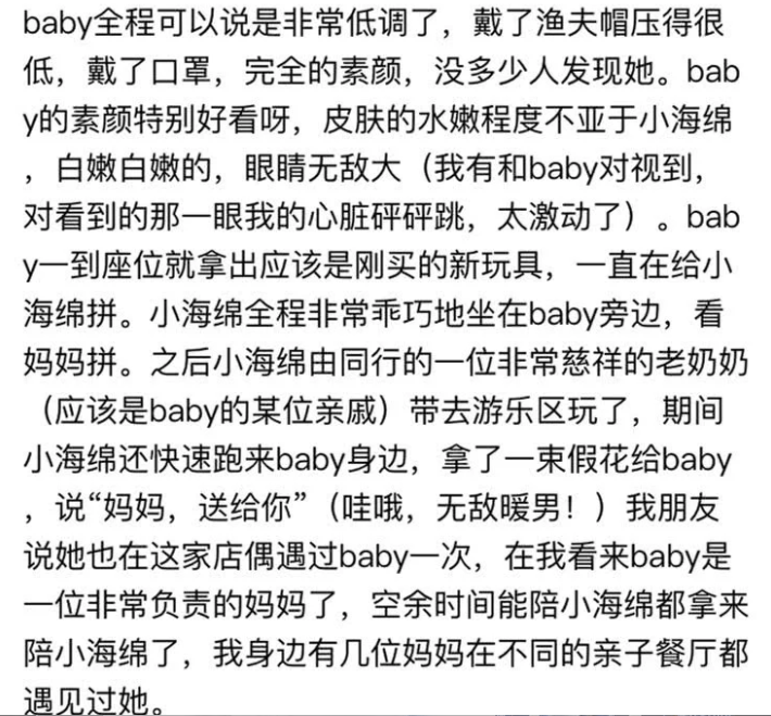 近日,有网友晒出亲自餐厅偶遇Baby母子的照