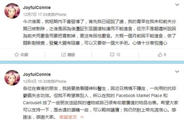 另外,近日有报道指她因为前夫一句“你胖了”才患上厌食症暴瘦,对此,伍智恒也发文强调,表示她的胃在和前夫分开前就被割除,是因为后遗症引致肠道粘连而不能进食,“从来不是报道所说因为前夫而厌食而要把胃割掉,更没有因他厌食”,并透露自己约一个月前因不能进食而做了显影剂检查,发觉大肠有阻塞状况,因此可能又要做一个大手术,心情十分害怕担心。