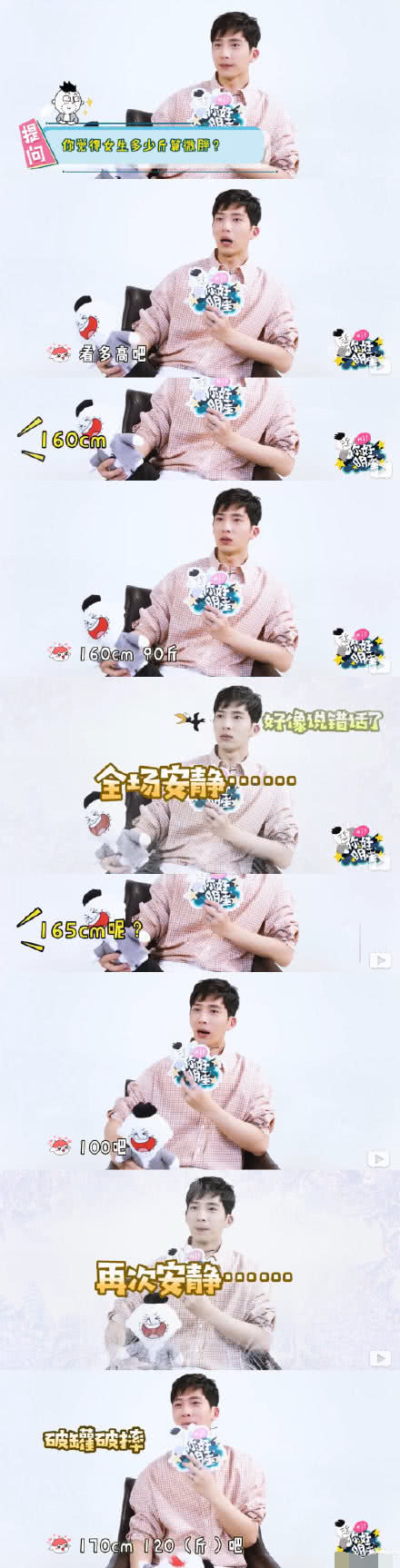 而井柏然的回答也可以说是钢铁直男的典型代表了,井柏然认为一米六的女生90斤就算微胖了,而一米六五的女生要在105斤以内,最后场面一度十分尴尬,井柏然也放宽了要求表示一米七的女生120斤就可以了。不少粉丝哭晕,这微胖界的条件也太苛刻了吧?