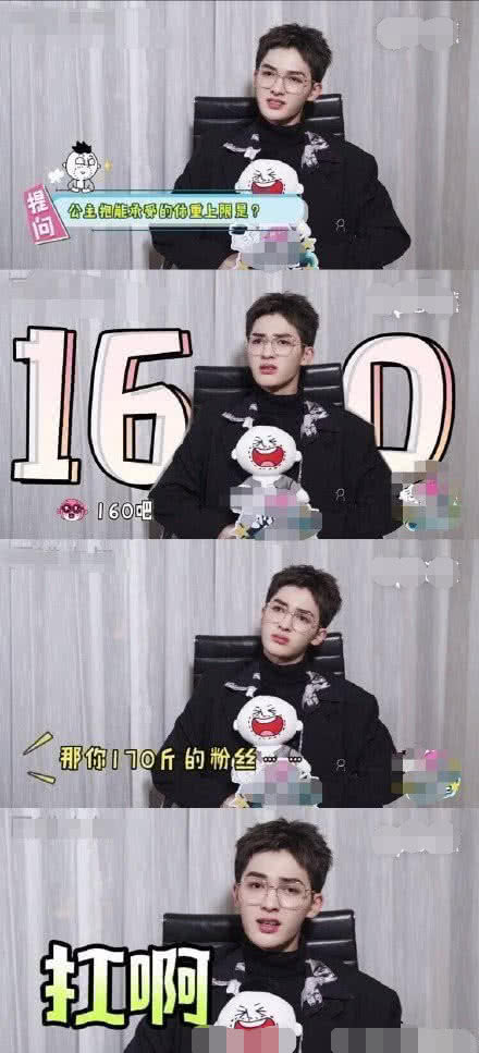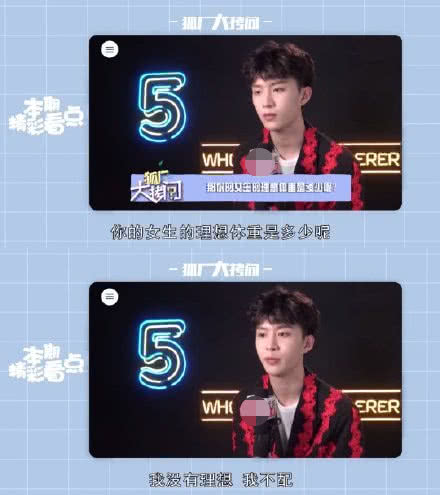 不过范丞丞还是没有控制住自己体内的直男灵魂,在主持人接着追问到“女生多少斤才算胖”的问题是,范丞丞秒打脸:“大家都流行问这一题吗?我实话实说,我到现在还是觉得100斤算胖,看你多高吧。”采访到这里时,范丞丞就已经破罐子破摔了,大方承认自己的想法,就是觉得女孩子100斤算胖,多少体重过百的粉丝要哭晕。