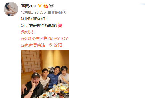 12月8日,认证为辽宁广播电视台编导的博主晒出何炅、肖战、鬼鬼的合影,并配文:“沈阳欢迎你们!”照片中,鬼鬼身着黄色毛衣摆出酷酷的表情,肖战坐在何老师旁边可爱地比“耶”。