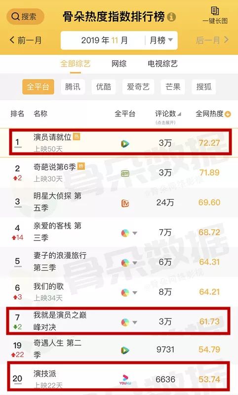 然而,从热度上来看,今年密集输出的表演类综艺却无力复刻曾经的火爆。截至发稿前,骨朵数据显示,11月综艺榜上,《演员请就位》全网热度排行第一,《我就是演员之巅峰对决》和《演技派》分别排在第7和第20名。