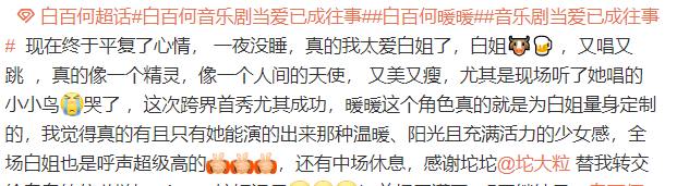 还有观众直接夸赞——“白百何的声音里有故事,在舞台上会发光”。
