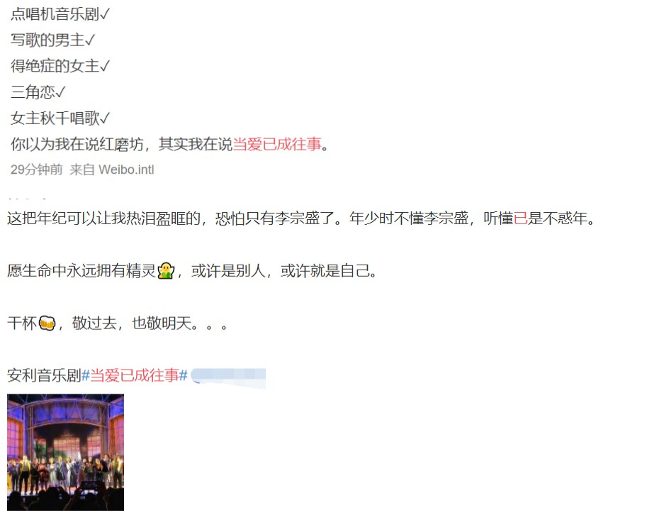 众多观众、大咖明星的纷纷打call和自发安利,也说明了音乐剧《当爱已成往事》的确有独到与特别之处。
