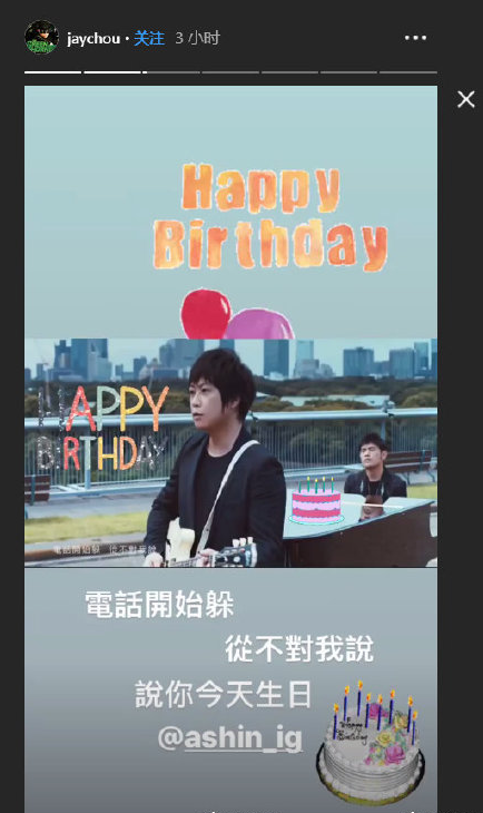 12月6日是歌手阿信的44岁生日。6日一早,周杰伦晒出和阿信在MV中的合照为其庆生,并将《说好不哭》的歌词修改为——“电话开始躲,从不对我说,说今天你生日”,同时他还在合照上贴心P上了生日蛋糕和气球贴图。