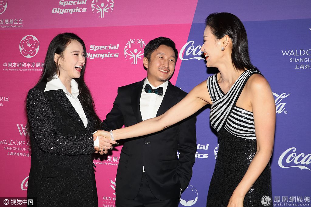 2019年12月5日,5日上海,2019特殊奥林匹克晚宴红毯:姚明、李娜、邹市明携妻子冉莹颖、王仪涵、胡杏儿、杨澜出席。胡杏儿涂红唇穿交叉礼裙秀香肩、与邹市明、冉莹颖夫妻握手合影秒变粉丝,李娜、杨澜穿黑西装美又飒,姚明穿西服帅气挺拔。 图片来源:签约供稿人/视觉