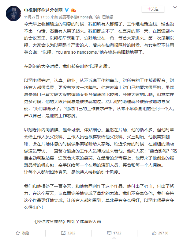 《怪你过分美丽》官微也发表长文追忆高以翔在剧组的往事,“我们都忘不了,在五月的那一天,在围读剧本的会议室里,以翔很早就到了,安静地坐在一角,等着大家进来。第一次见到以翔,大家会以为以翔是个严肃的人,后来在拍海报照片的时候,有女生忍不住用英文说:‘以翔,You are so handsome’。他在镜头前腼腆地笑了。”文中称,高以翔内向腼腆,温柔可亲,体贴细心。虽然在片场话不多,但时常给工作人员买饮料,买三明治。