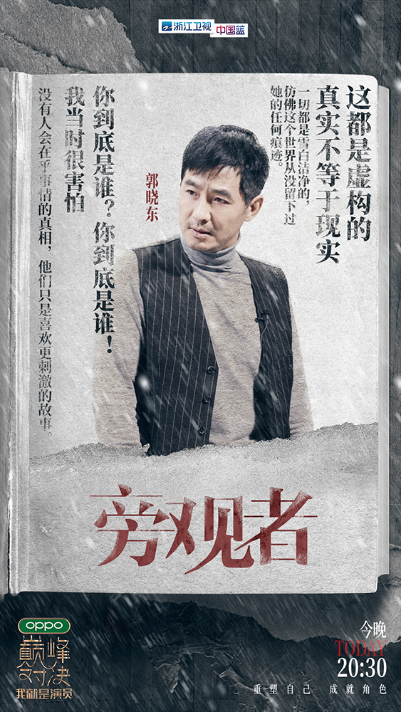大型原创表演类综艺《我就是演员之巅峰对决》节目热度持续走高,此次第四场竞演,郭晓东与李宇春合作出演《旁观者》,郭晓东饰演作家韩杰,李宇春则饰演韩杰的书迷。该剧目故事情节扑朔迷离,诸多反转,两人凭借精湛的演技和默契的配合,成功拿下本场竞的第一