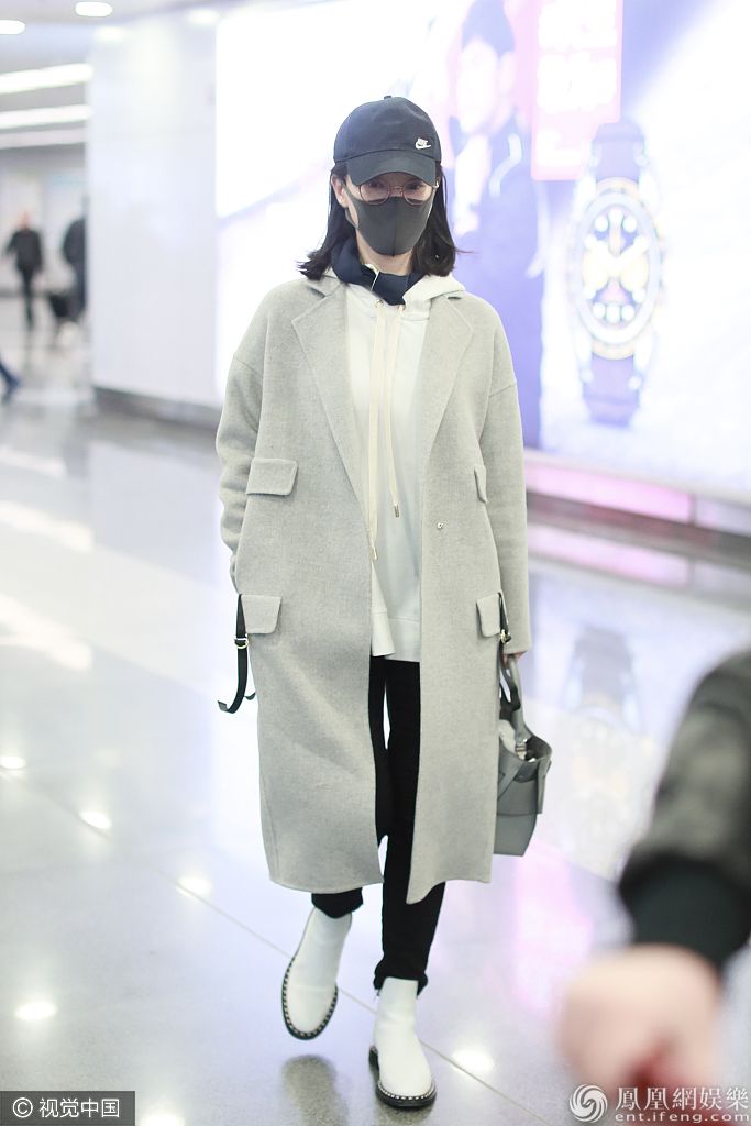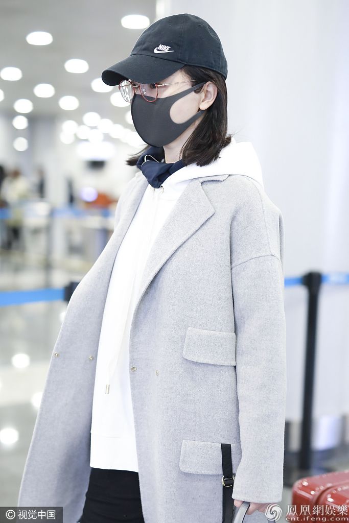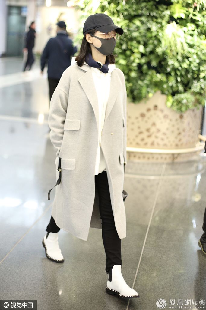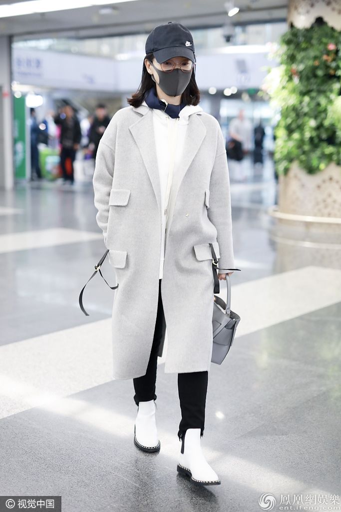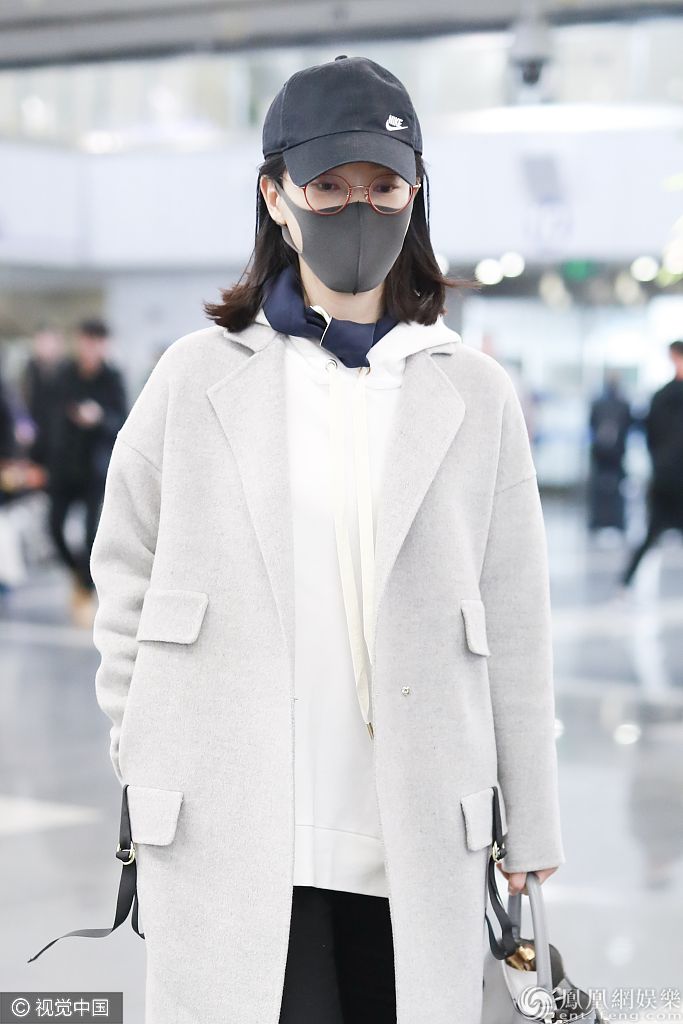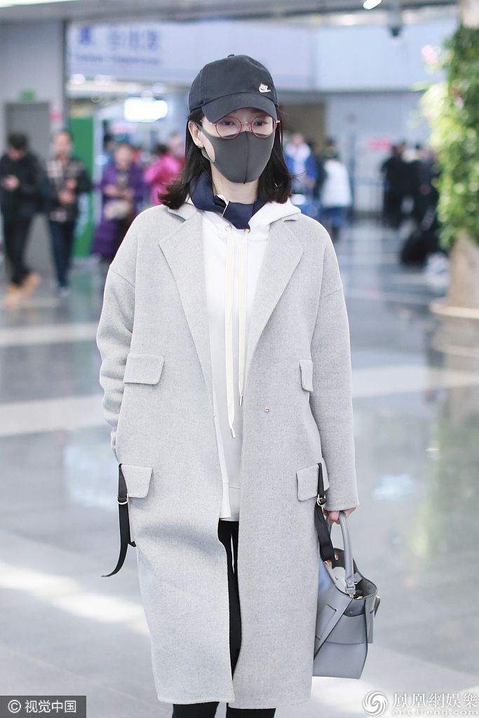 2019年11月15日,北京,陈数现身机场。她戴金丝眼镜口罩遮面尽显文艺范儿,身穿呢子大衣内搭卫衣清新时尚。 图片来源:o/视觉