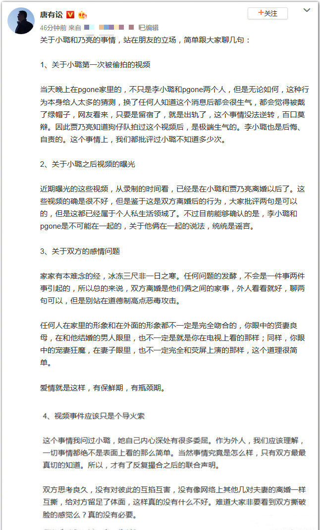 11月15日,李小璐好友发文谈及李小璐和贾乃亮离婚之事,他表示近期曝光的视频是在离婚后拍的,属个人私生活,而且可以确认李小璐和PGone不可能在一起。同时还表示:“任何人在家里的形象和在外面的形象都不一定是完全吻合的。”最后,他认为两人离婚没有互掐互撕已经很是体面,事情究竟是怎么样,只有双方最最真切的知道,外人不应该站在道德制高点攻
