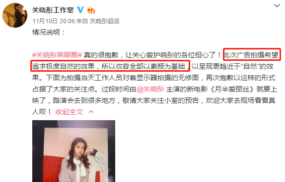 也就是说,关晓彤是全素颜拍的,黑眼圈、肤色暗沉、精神差都很正常,大家别见怪哈。