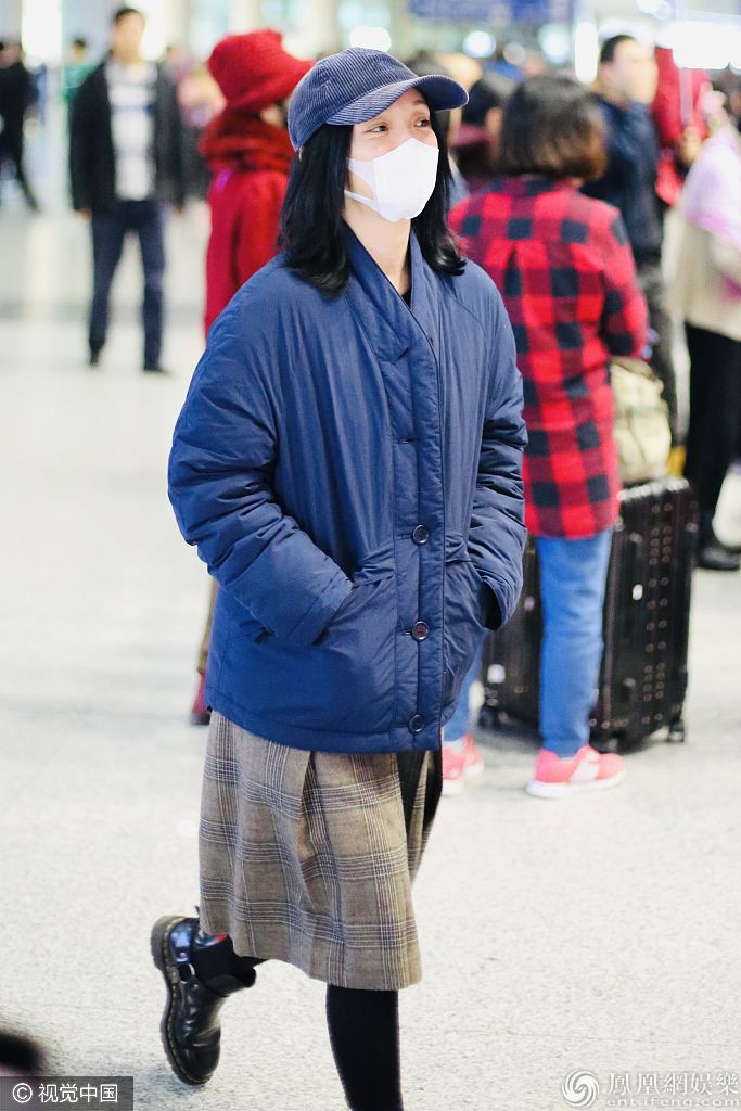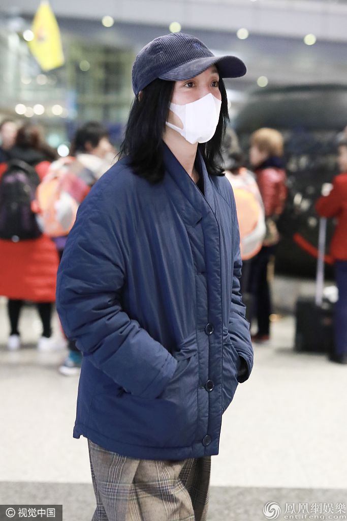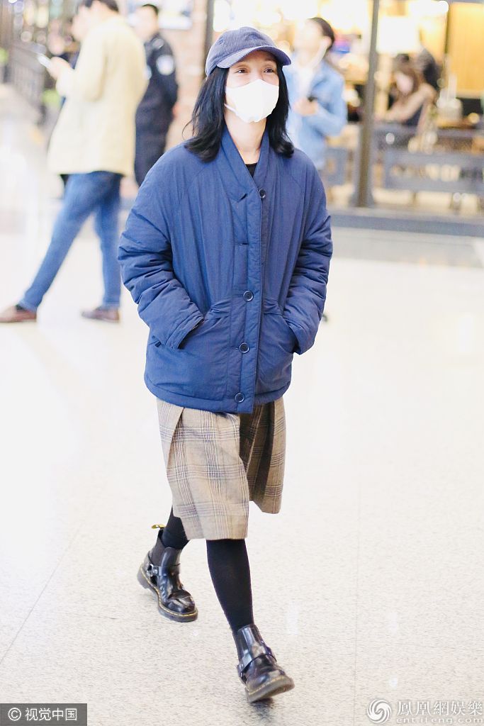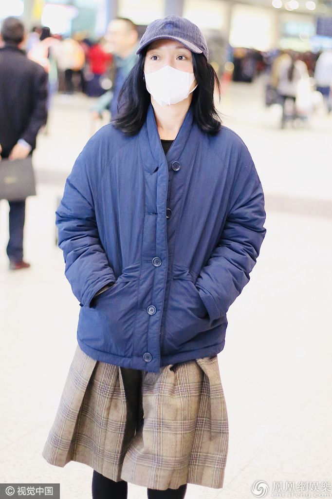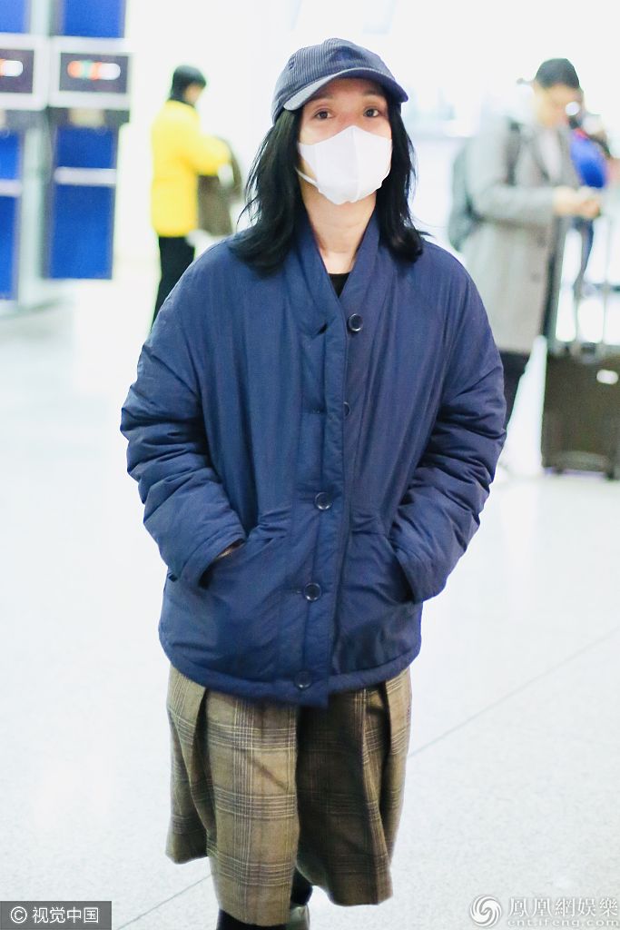 2019年11月11日,北京,周迅现身机场。她素颜口罩遮面难掩白皙皮肤,身穿棉袄插兜御寒超接地气,搭配格纹阔腿裤玩转时尚混搭风,深秋保暖穿搭学起来! 图片来源:c/视觉