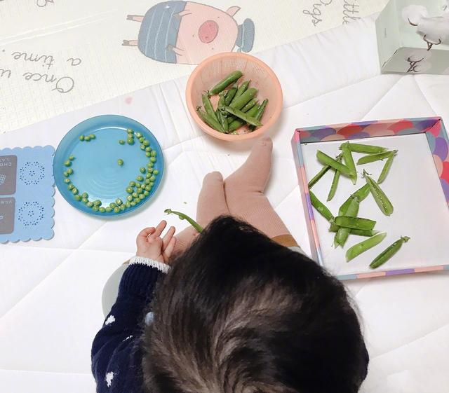 小小丹还不会走路的时候,就在家里剥豆子,十分乖巧。