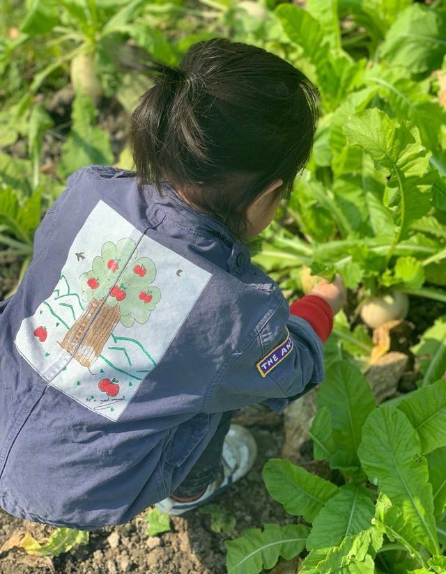 小小丹蹲在田里,用肉乎乎的小手拔萝卜的背影充满了童趣,可能摔得一身泥就是发生在萝卜拔出的那一刻吧。鞋子看起来已经很脏了,但是丝毫不影响小小丹对田园生活的热爱。
