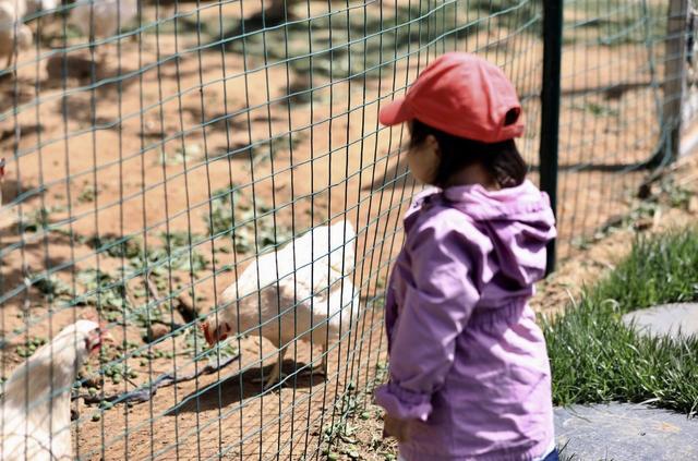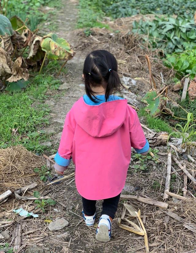 田间的菜叶子十分茂盛,个子小小的2岁小小丹都快要淹没在中间。小家伙无所畏惧地自己走在了前面,十分勇敢。