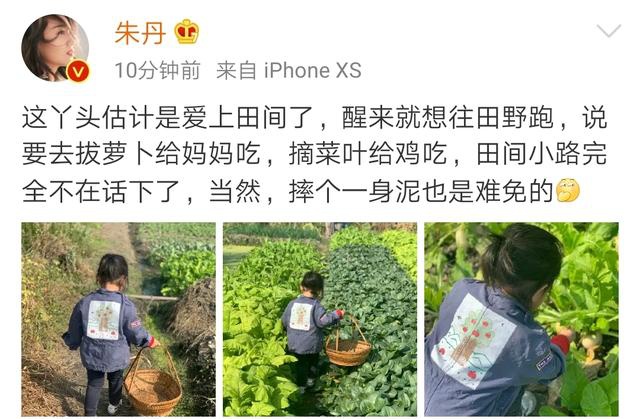 11月10日,也就是第二天,朱丹再次晒出了下地的小小丹,并感慨道:这丫头估计是爱上田间了,醒来就想往田野跑,说要去拔萝卜给妈妈吃,摘菜叶给鸡吃,田间小路完全不在话下了,当然,摔个一身泥也是难免的。