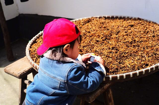 朱丹晒藕粉的时候,小小丹也在旁边看着。