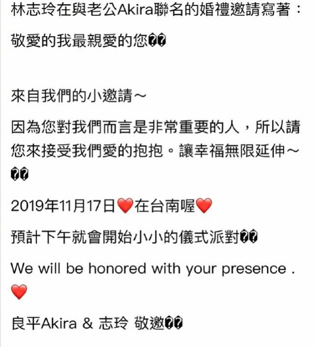 11月6日,有爆料指林志玲早已秘密筹备婚礼,两人婚礼请柬也随之曝光,请柬上标明婚礼时间为11月17日,地点为林爸爸的家乡台南。