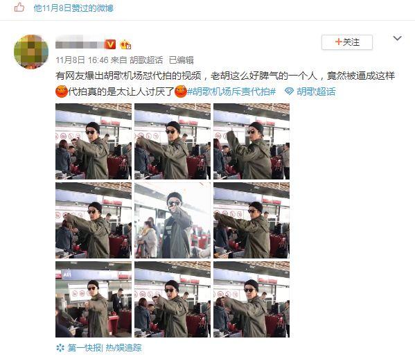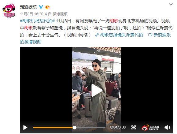 11月8日,有网友曝光胡歌现身北京机场的视频。视频中胡歌戴着墨镜指着镜头说:“再说一遍别拍了啊,还拍?”疑似斥责代拍,看上去十分生气。