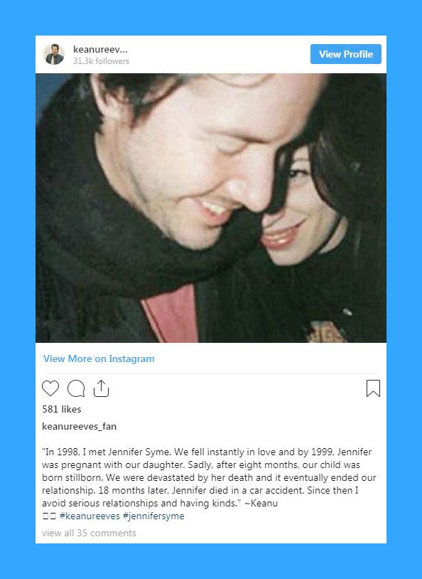 1998年基努遇到自己的一生挚爱Jennifer Syme(詹妮弗·西姆),他们在摇滚乐队Dogstar的演唱会上一见钟情。