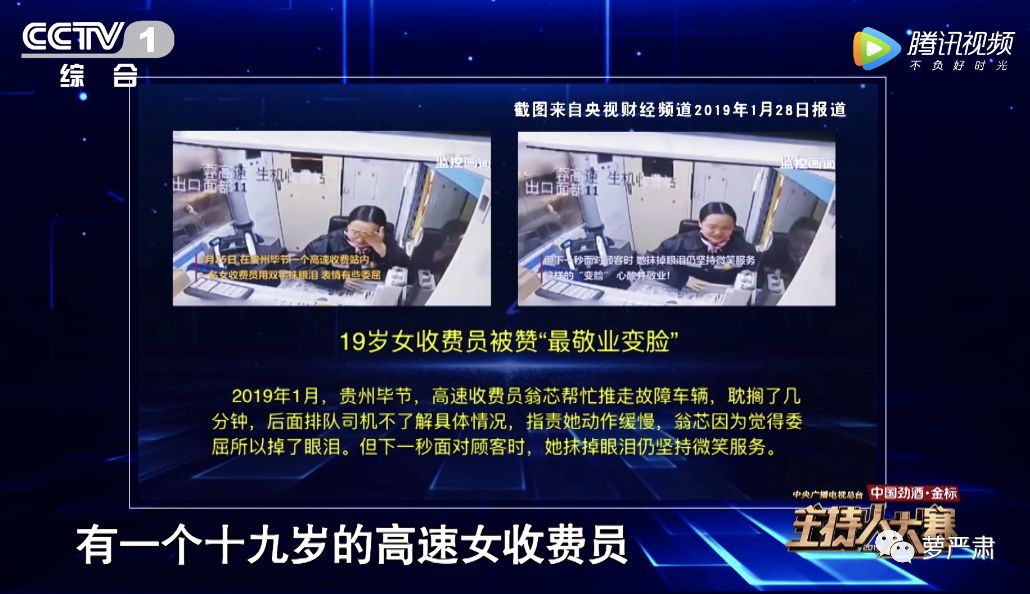 主持人大赛给选手出的即兴题目是点评“最敬业变脸”,19岁的女收费员被误会掉了眼泪,但下一次面对顾客时仍然坚持微笑服务。