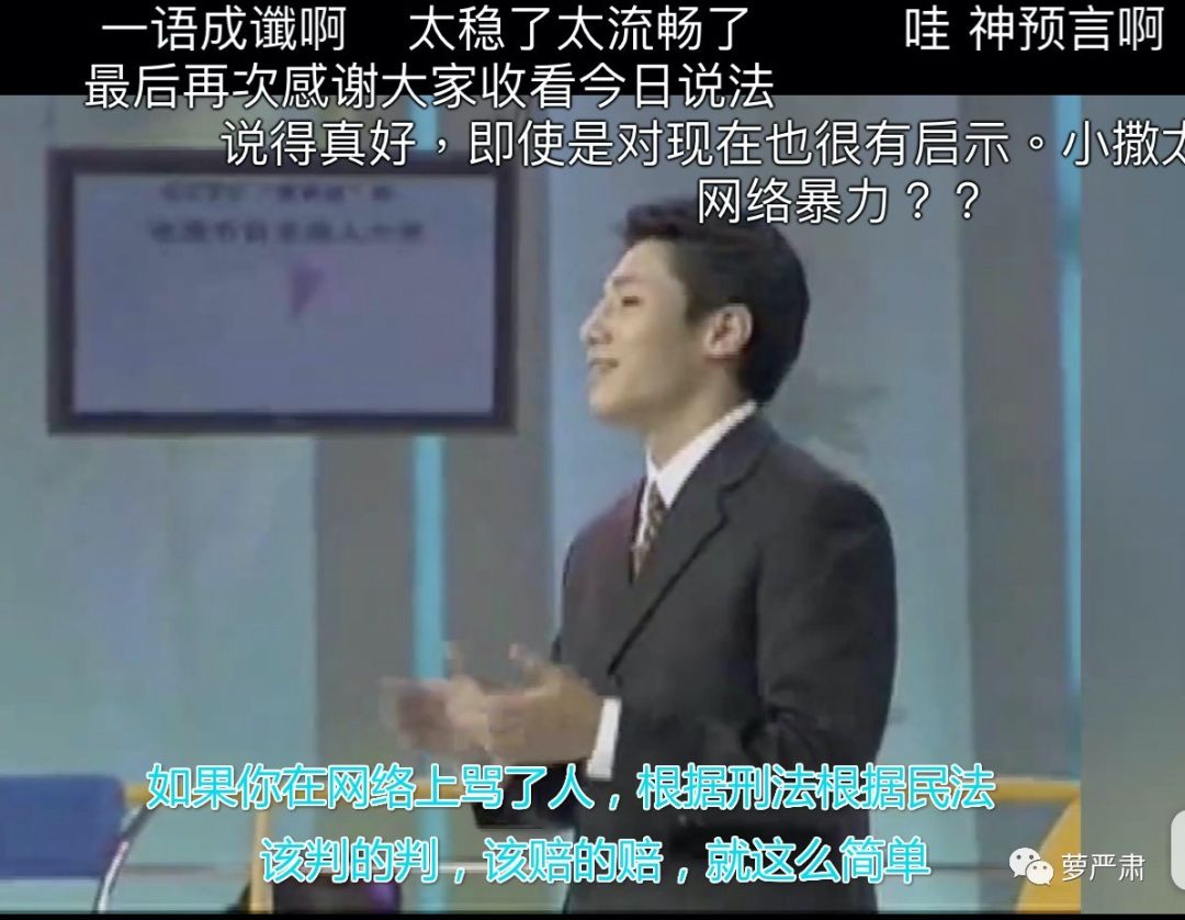 现场出题主持的法制节目非常流畅,当时他的结语完美预言了未来网络舆论的情况:“如果你在网络上(恶意)骂了人,根据刑法根据民法,该判的判,该赔的赔。”