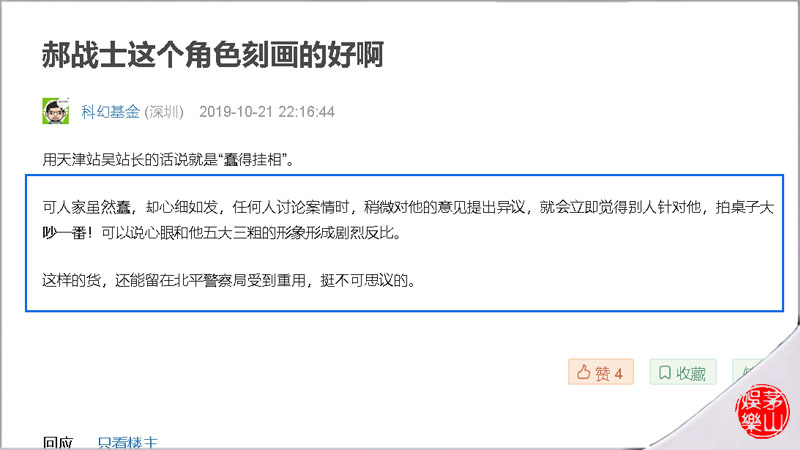 然而,演员张隽溢所扮演的前游击队队长、现北平市公安局侦讯处侦查科行动组组长郝平川,却让很多观众很失望了。有网友这样评论郝平川一角给观众留下的印象:“可人家虽然蠢,却心细如发,任何人讨论案情时,稍微对他的意见提出异议,就会立即觉得别人针对他,拍桌子大吵一番!可以说心眼和他五大三粗的形象形成剧烈反比。这样的货,还能留在北平警察局受到重用,挺不可思议的。”
