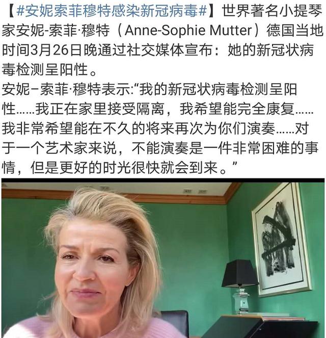 3月27日,最新消息称世界著名的小提琴家安妮·索菲·穆特确诊感染新冠肺炎,她通过自己的社交网站上宣布了自己新冠肺炎检测呈阳性的情况。在视频中安妮·索菲·穆特表示:“我的新冠肺炎检测呈阳性,我在家里被隔离了很长时间,并期待着完全康复