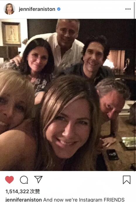 近日,瑞秋在ins发了一张《老友记》六人合体图,说:And now we're Instagram FRIENDS。意会的话,大概就是玩笑说,现在我们是网友