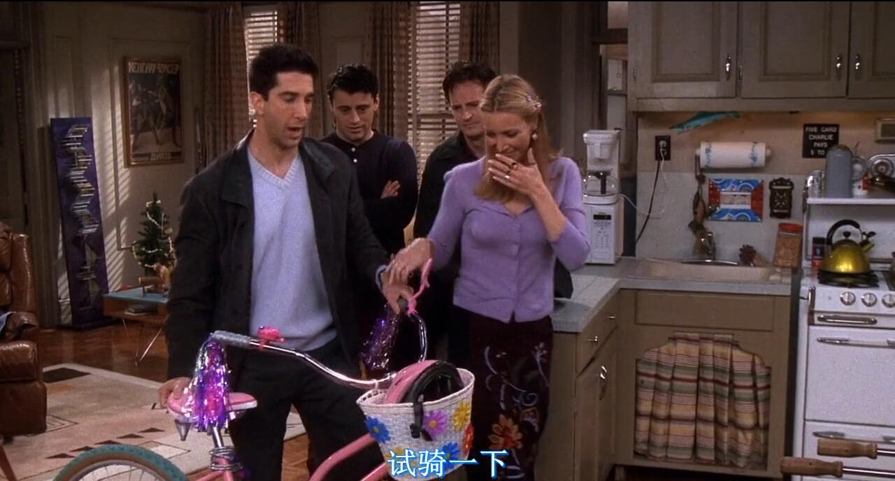 菲比小时候家里很穷,她很羡慕隔壁孩子的自行车,邻居把自行车的包装盒送给她。盒子上有个自行车图案,菲比就坐在上面……罗斯说每个人都应该有自己的第一辆自行车,就买了粉色的自行车送给菲比,还强迫菲比学。他的理由是以防万一,“万一有人拿枪指着你,说快骑那辆车,不然我就开枪”,哈哈哈你够了。